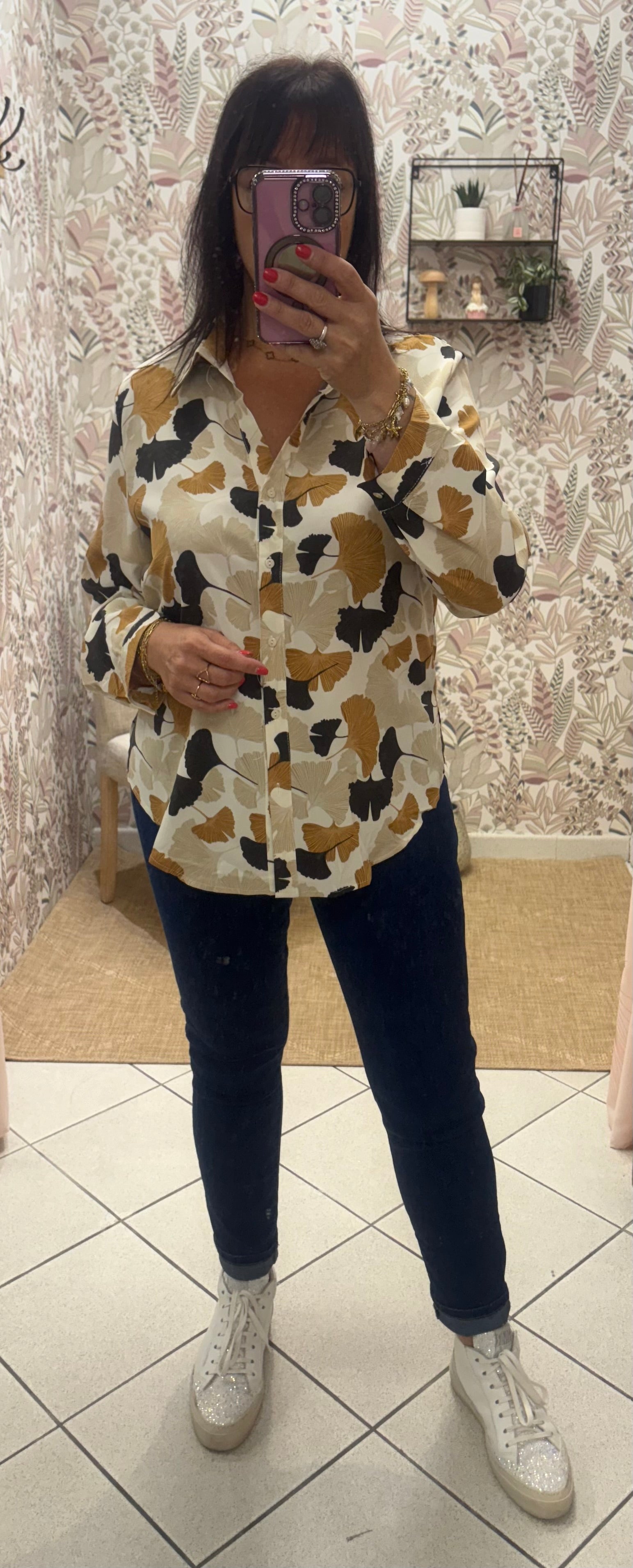Chemisier dans les tons de beige, moutarde et chocolat. Manches longues